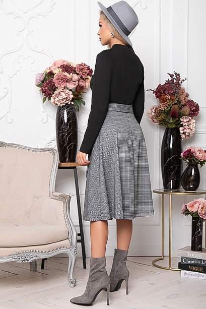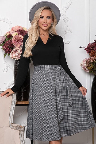Комбинированное платье,отрезное по линии талии.Верх из плотного джерси,юбка клеш из жаккардового трикотажного полотна.Пояс в комплекте.