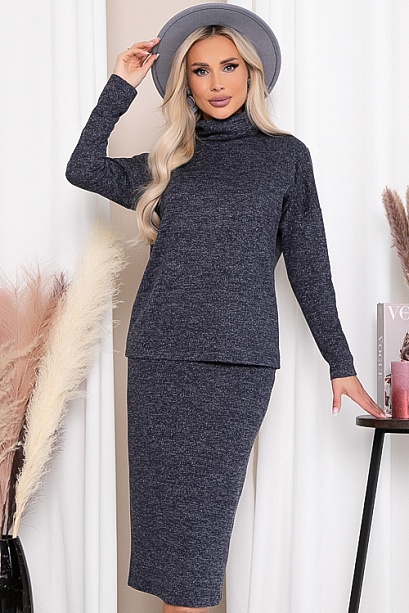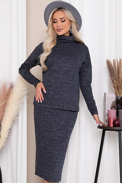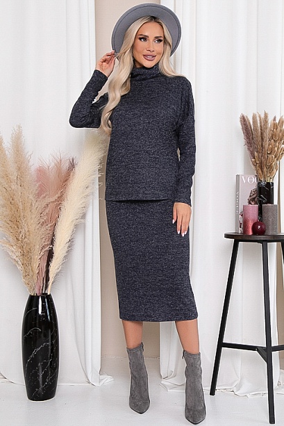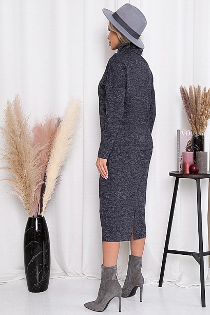 Комплект из трикотажного полотна,состоит из джемпера и юбки.Джемпер свободного силуэта с воротником хомут.Юбка с эластичной резиной по поясу и разрезом в среднем шве спинки.