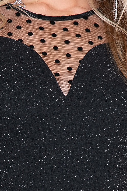 Платье из трикотажного полотна с блеском,горловина с фигурной кокеткой из сетки в горох.В среднем шве спинки застежка молния.