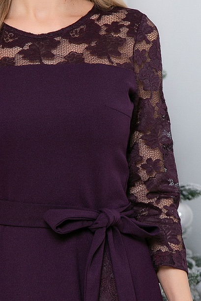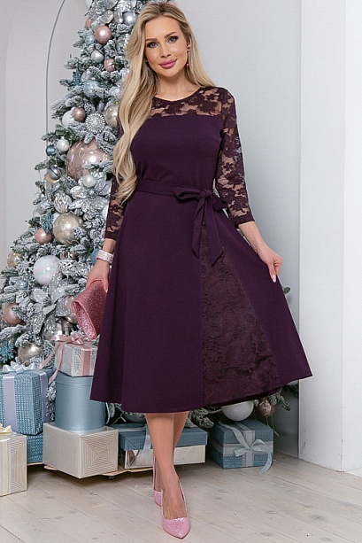Платье из трикотажного полотна,отрезное по линии талии.Юбка расклешенная по переду втачной клин из кружева на подкладе.Кокетки и рукава из кружевного полотна.Пояс в комплекте.