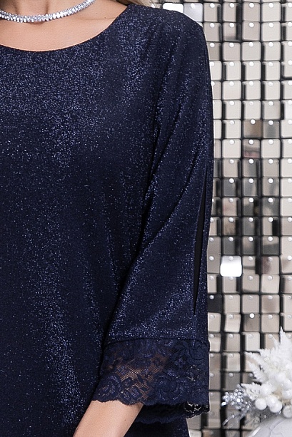 Платье А-образного силуэта из трикотажного полотна с люрексом.Рукав 3/4 с оригинальной вставкой из сетки и манжетом из кружевного полотна.