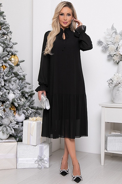 Платье А-образного силуэта с притачной оборкой по низу из шифона на трикотажном подкладе.