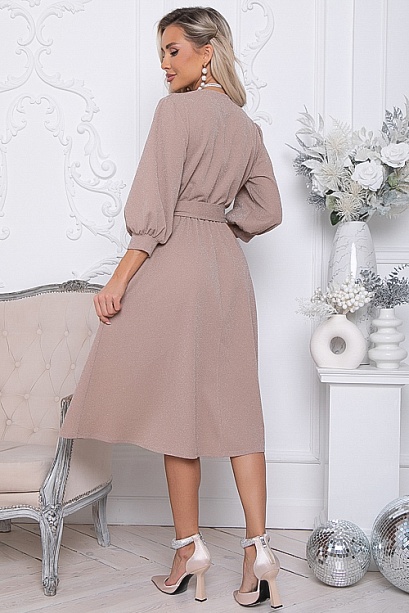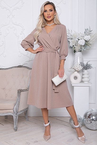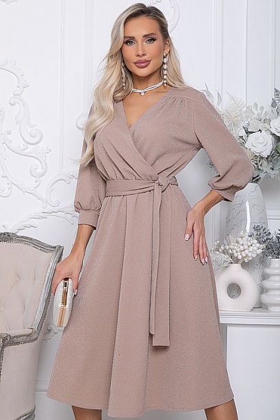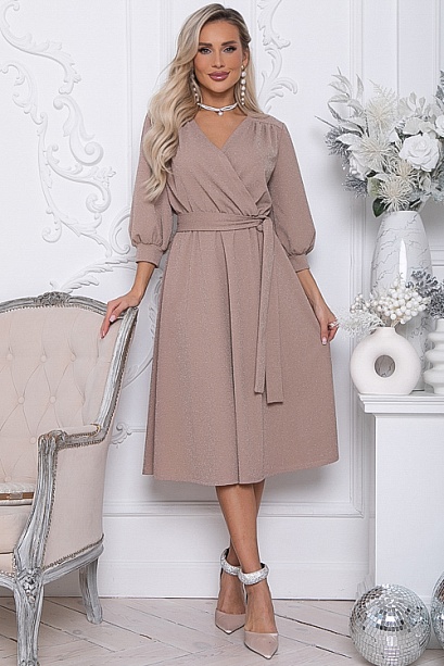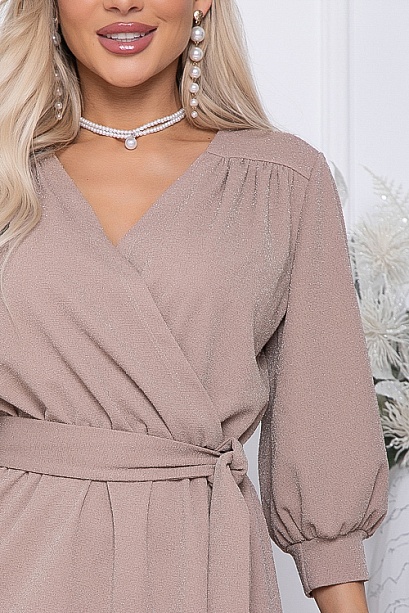 Платье из трикотажного полотна с люрексом,отрезное по линии талии с эластичной резиной,юбка расклешенная летящая.По лифу эффектный запах.Пояс из основной ткани в комплекте 30% вискоза,65% п/э,5% лайкра