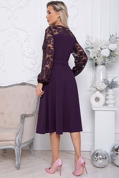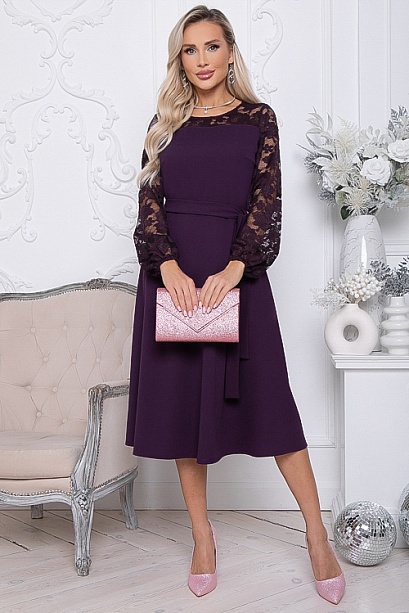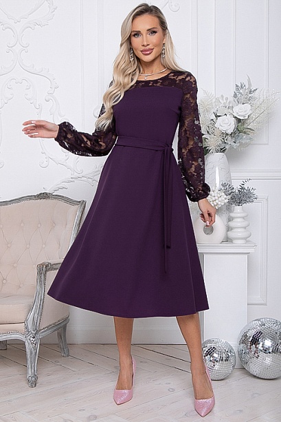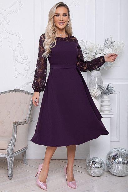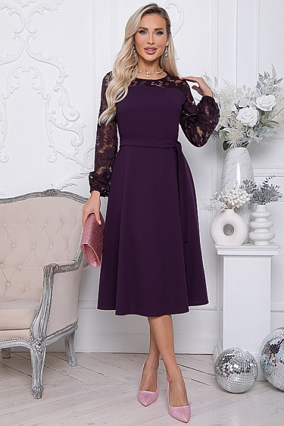 Нарядное платье из трикотажного полотна ,отрезное по линии талии с расклешенной юбкой.Втачные рукава и кокетки по переду и спинки лифа из эластичного кружева.Пояс из основной ткани в комплекте. 30% вискоза,65% п/э,5% лайкра