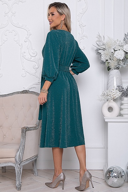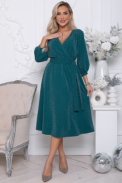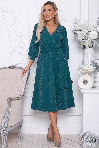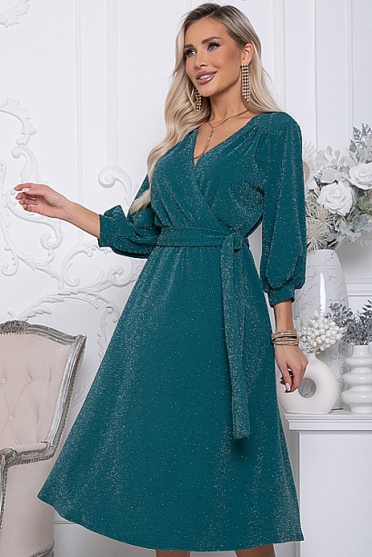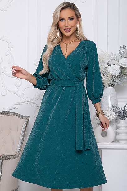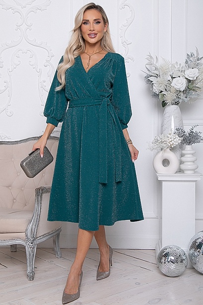 Платье из трикотажного полотна с люрексом,отрезное по линии талии с эластичной резиной,юбка расклешенная летящая.По лифу эффектный запах.Пояс из основной ткани в комплекте.