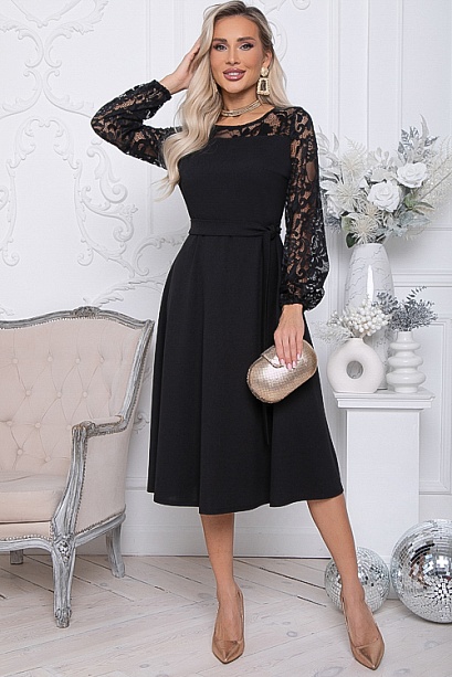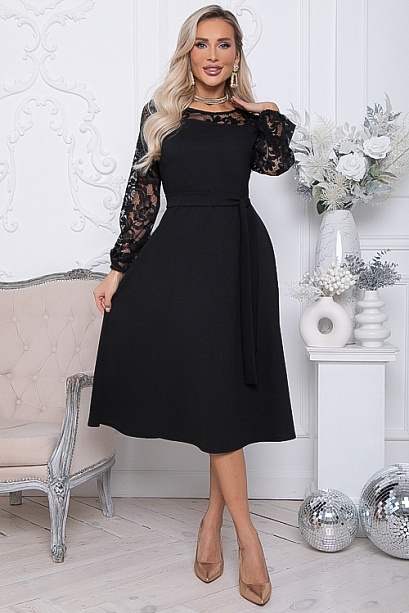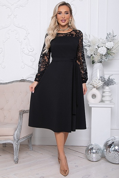 Нарядное платье из трикотажного полотна ,отрезное по линии талии с расклешенной юбкой.Втачные рукава и кокетки по переду и спинки лифа из эластичного кружева.Пояс из основной ткани в комплекте.
