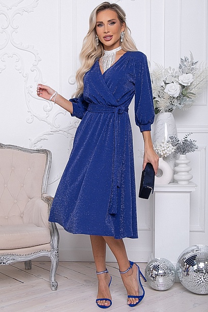 Платье из трикотажного полотна с люрексом,отрезное по линии талии с эластичной резиной,юбка расклешенная летящая.По лифу эффектный запах.Пояс из основной ткани в комплекте.