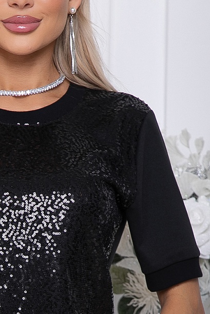 Блузка из трикотажного полотна джерси.Горловина,манжеты рукавов и притачной пояс из хлопковой трикотажной рибаны.Полочка из полотна с пайетками.