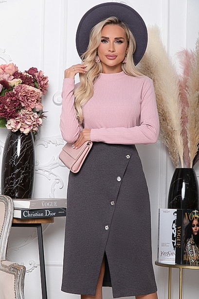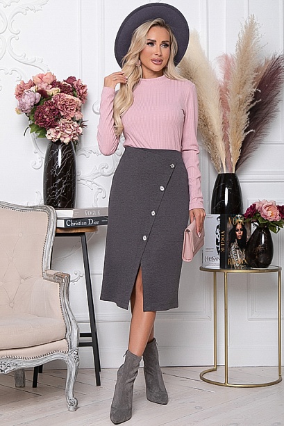 Юбка из трикотажного полотна джерси с имитацией запаха и декоративными пуговицами,в среднем шве спинки застежка молния. 60% вискоза,35% п/э,5% лайкра