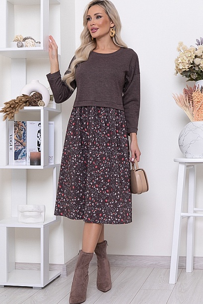 Комбинированное платье свободного силуэта.Верх из трикотажного полотна,низ из текстильного полотна. Состав: верх 50% вискоза,45% п/э,5% лайкра низ 30% вискоза,65% п/э,5% лайкра