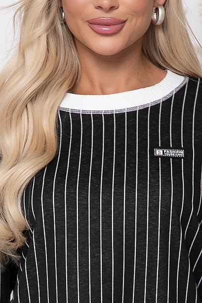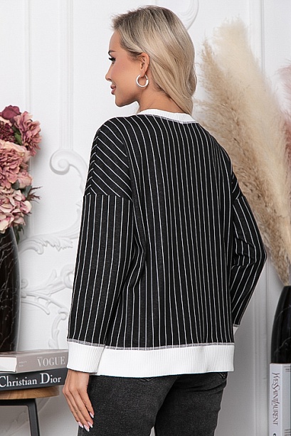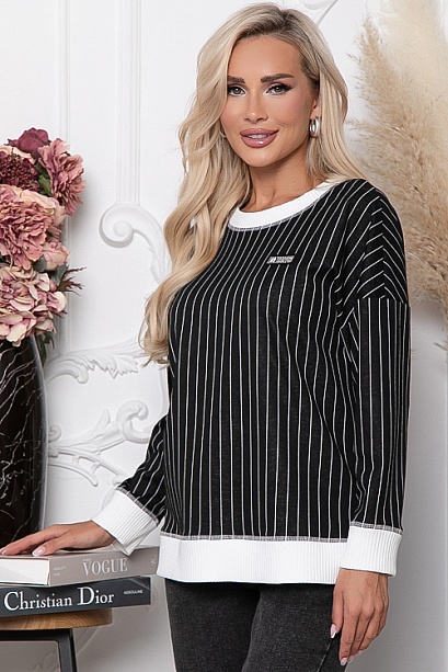 Джемпер из жаккардового трикотажного полотна в полоску свободного силуэта, дополнен  отделкой  вискозной,трикотажной белой рибаной. 60% вискоза,35% п/э,5% лайкра