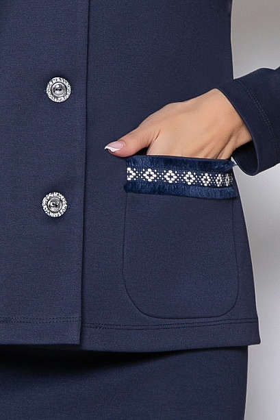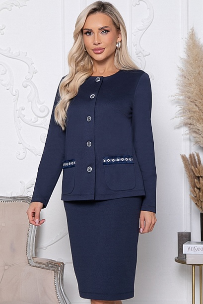 Комплект из трикотажного полотна джерси,состоит из жакета и юбки.Жакет в стиле шанель прямого,свободного силуэта с центральной застежкой на пуговицы.По переду накладные карманы с декоративной тесьмой.Юбка карандаш по талии эластичная резина,в среднем шве спинки шлица.