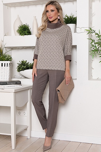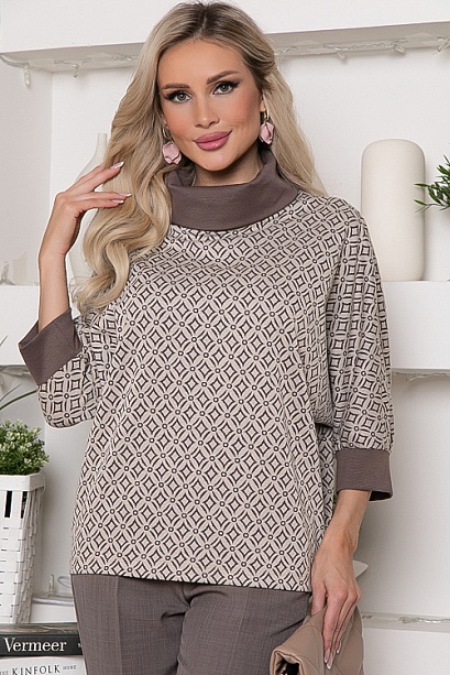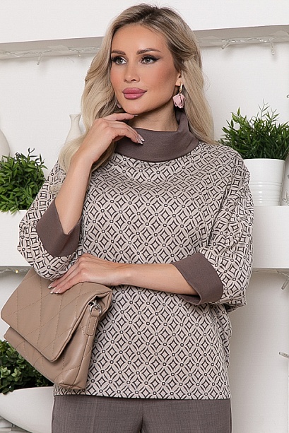 Джемпер из жаккардового трикотажного полотна свободного силуэта с цельнокроеными рукавами и контрастной отделкой.Ворот-хомут и манжеты рукавов из трикотажного вискозного джерси. 60% вискоза,35% п/э,5% лайкра