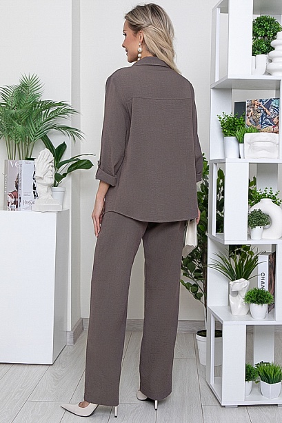 Брючный комплект из комфортного текстильного полотна.Рубашка свободного силуэта с отложным воротником на стойке и центральной застежкой на пуговицы.По переду декоративные клапана.Брюки свободного,прямого силуэта с эластичной резиной по поясу. 67% вискоза,30% лен,3% спандекс