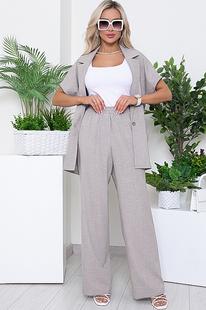 Комплект из легкой костюмной ткани.Жакет свободного силуэта с цельнокроеными рукавами, центральной застежкой на одну пуговицу и удобными функциональными карманами по переду.Воротник отложной с лацканами.Брюки свободного прямого силуэта с высокой посадкой и эластичной резиной по поясу.