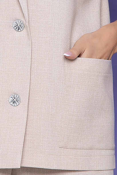 Комплект из легкой костюмной ткани.Жакет свободного силуэта с цельнокроеными рукавами, центральной застежкой на две пуговицы и удобными функциональными карманами по переду.Воротник отложной с лацканами.Шорты свободного прямого силуэта с высокой посадкой по переду имитация гульфика,по бокам функциональные карманы.Пояс собран на эластичную резину по бокам и спинке.