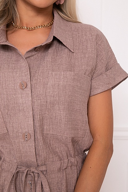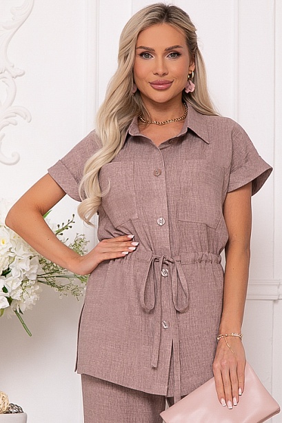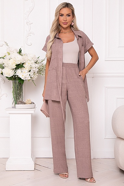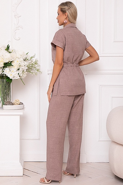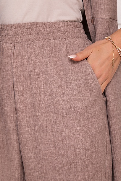 Брючный комплект из текстильного полотна.Жакет свободного силуэта с цельнокроеными рукавами и отложным манжетом.Перед с центральной застежкой на пуговицы,накладными карманами и кулиской по талии.Воротник отложной на стойке.По бокам разрезы.Брюки с высокой посадкой,прямого силуэта,по поясу эластичная резина,без застежки с имитацией гульфика.По бокам карманы.