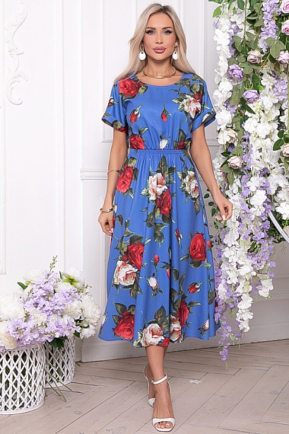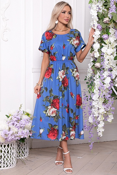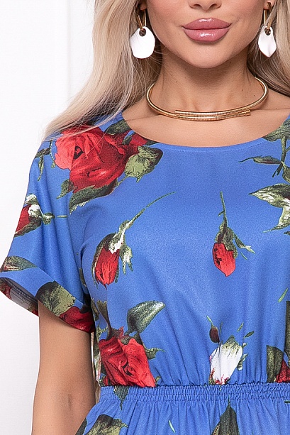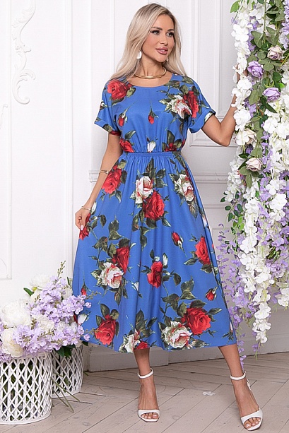 Платье из текстильного полотна,отрезное по линии талии присборено на эластичную резину с расклешенной летящей юбкой.