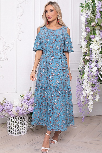 Платье из текстильного полотна трапецевидного свободного силуэта с притачным воланом по низу.Пояс из основной ткани в комплекте.