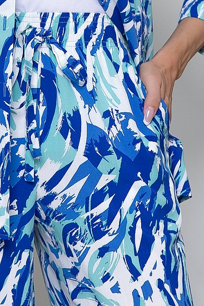 Комплект из комфортного вискозного текстильного полотна,состоит из рубашки и брюк.Рубашка свободного силуэта с центральной застежкой на пуговицы.Воротник отложной на стойке.