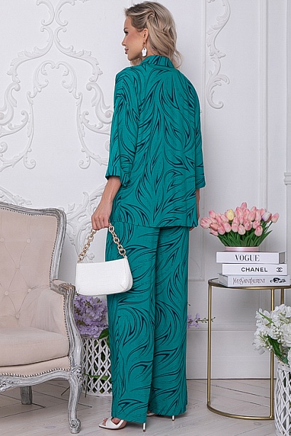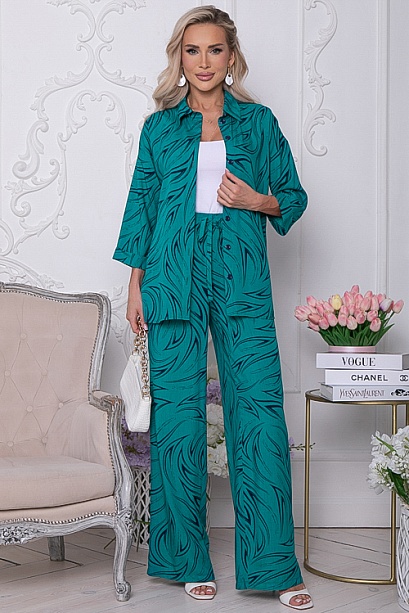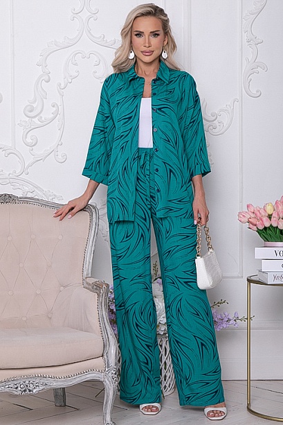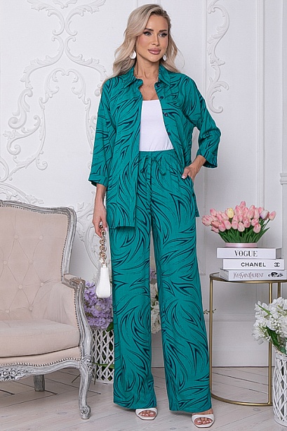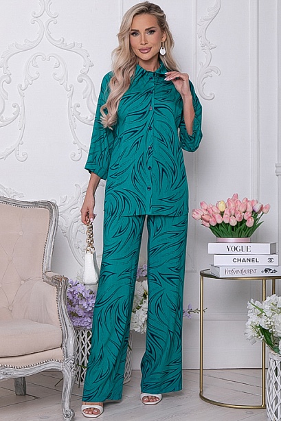 Комплект из комфортного вискозного текстильного полотна,состоит из рубашки и брюк.Рубашка свободного силуэта с центральной застежкой на пуговицы.Воротник отложной на стойке.