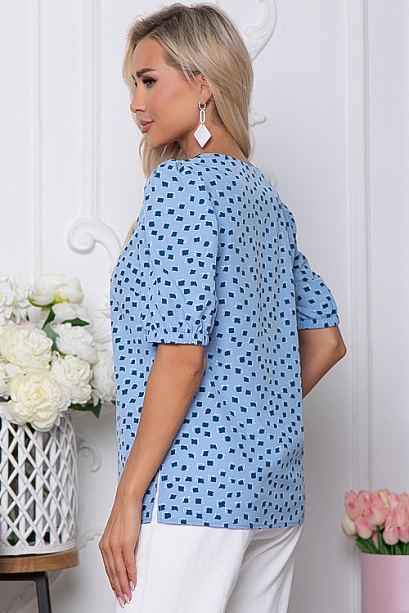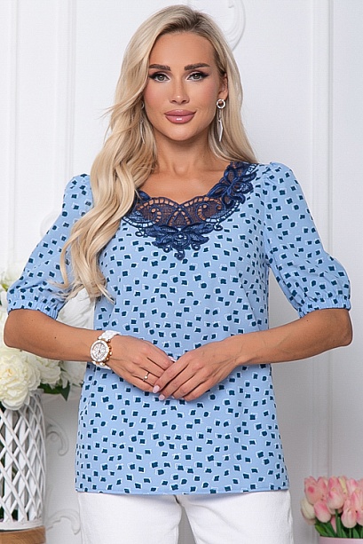 Блузка из текстильного полотна свободного силуэта.Горловина оформлена плетеным кружевным элементом.