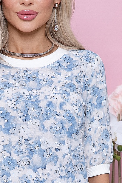 Блузка из текстильного полотна с отделкой белой трикотажной хлопковой рибаной. 30% вискоза,65% п/э,5% лайкра