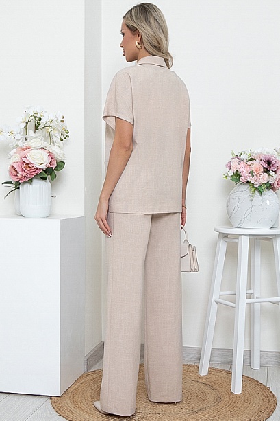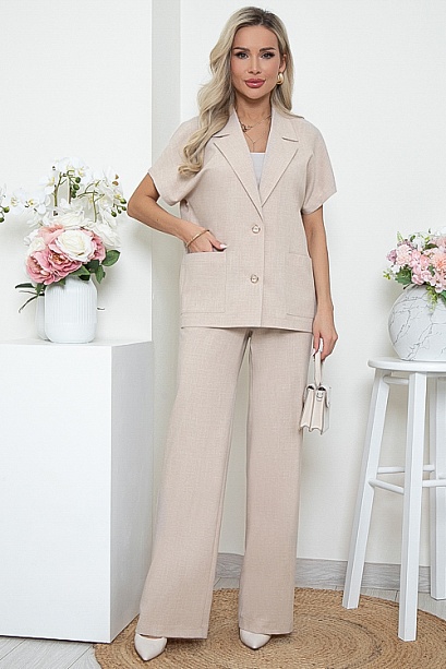 Комплект из легкой костюмной ткани.Жакет свободного силуэта с цельнокроеными рукавами, центральной застежкой на две пуговицы и удобными функциональными карманами по переду.Воротник отложной с лацканами.Брюки свободного,прямого силуэта, удобную посадку по талии обеспечивает эластичный пояс,который по бокам и спинке собран на резину,в боковых швах функциональные карманы.
