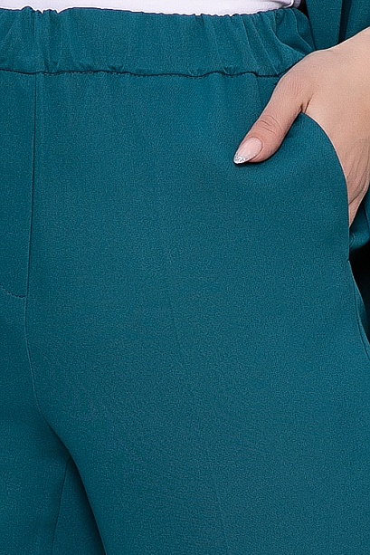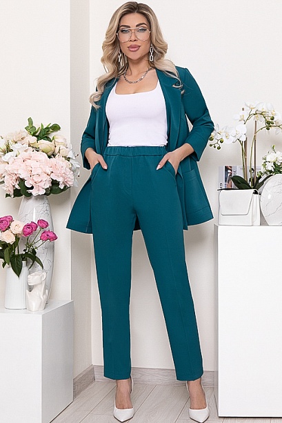 Брючный комплект из костюмной ткани.Жакет свободного силуэта с застежкой на одну пуговицу.Воротник отложной с лацканами.По переду жакета накладные удобные карманы.