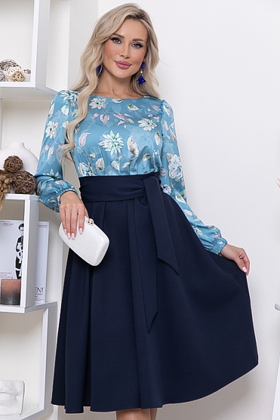 Комбинированное платье.Лиф из искусственного шелка,юбка летящая расклешенная из костюмной ткани присобрана на эластичную резину.В комплекте длинный пояс.