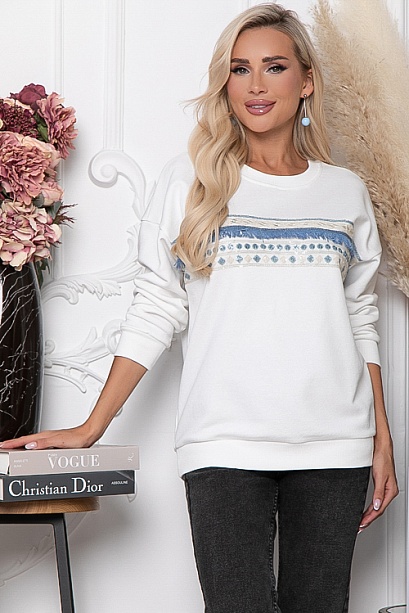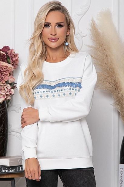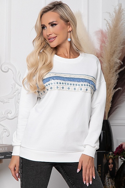 Свитшот из хлопкового трикотажного полотна(футер трехнитка) свободного силуэта(ткань производство Турция) свободного силуэта с отделкой трикотажной рибаной и декоративным элементом в виде пайеток и бахромы.