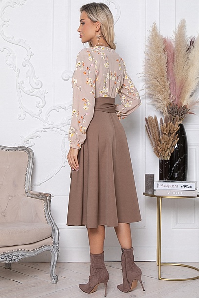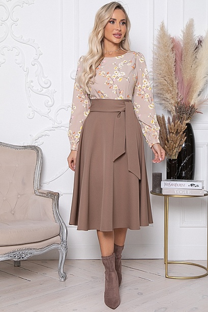 Комбинированное платье.Лиф из текстильного полотна с рельефами и застежкой молния по спинке,юбка летящая расклешенная из костюмной ткани.В комплекте длинный пояс.