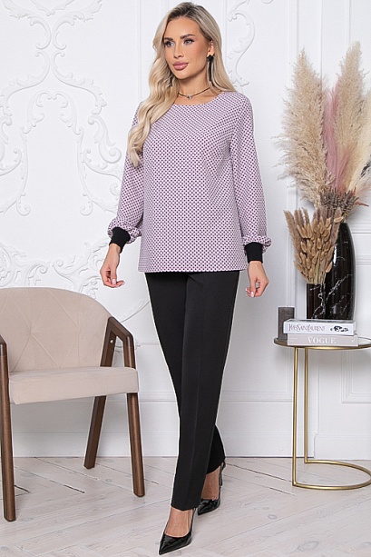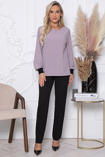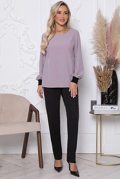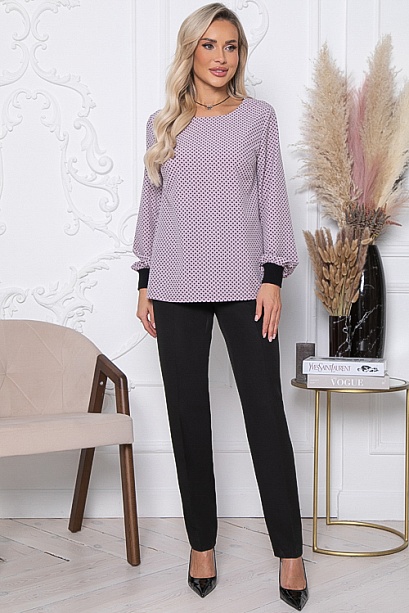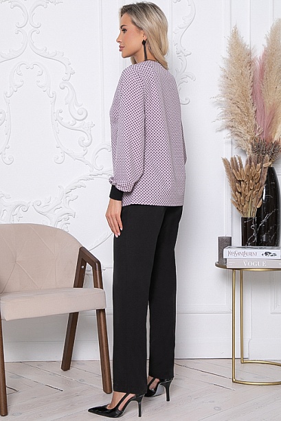 * Комплект состоящий из блузки и брюк. Блузка свободного силуэта из текстильного полотна, низ рукавов с манжетами из трикотажной рибаны.Брюки из костюмной ткани с высокой посадкой, зауженные к низу, по поясу эластичная резина .В среднем шве переда имитация гульфика. По бокам функциональные карманы. Заутюженные стрелки придают стройность фигуре.