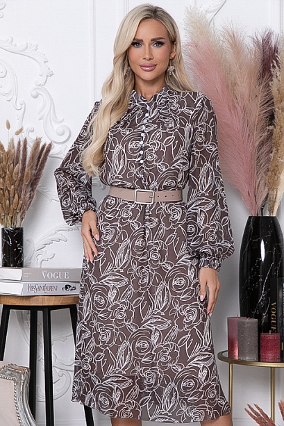 Платье из шифона,на трикотажном подкладе А-образного силуэта.Воротник стойка. По переду центральная застежка на навесные петли и пуговицы.Пояс из основной ткани в комплекте.Ремень в комплект не входит.