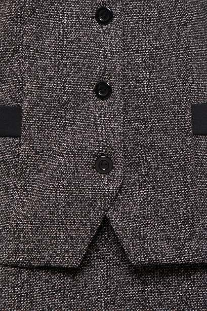 Комплект в стиле шанель из трикотажного полотна твид.Состоит из жакета и юбки.Жакет полуприлегающего силуэта с контрастной отделкой и центральной застежкой на петли и пуговицы.Юбка карандаш с поясом на резине.