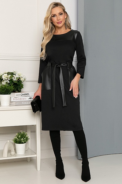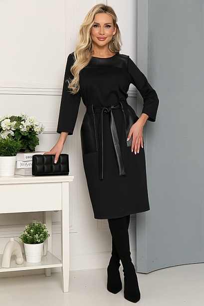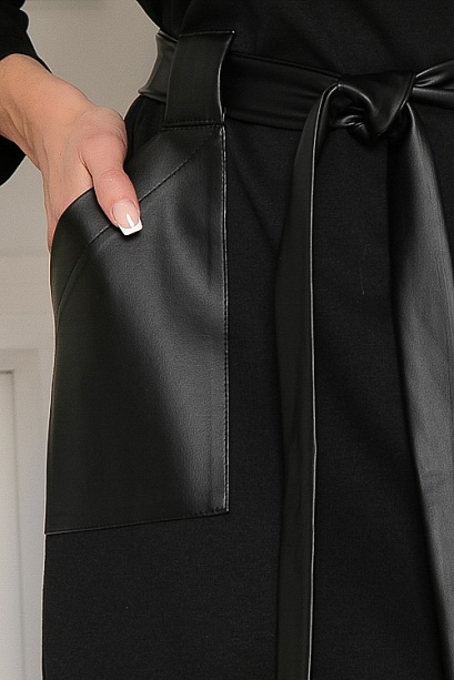 * Платье из трикотажного полотна джерси свободного силуэта ,с накладными карманами из экокожи и поясом.