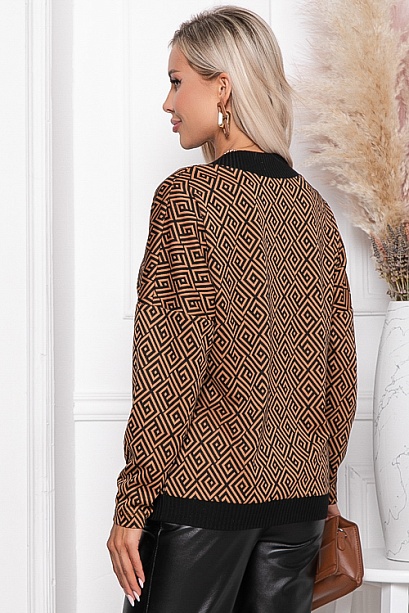 Джемпер из жаккардового трикотажного полотна свободного силуэта с отделкой трикотажной рибаной по V-горловине.