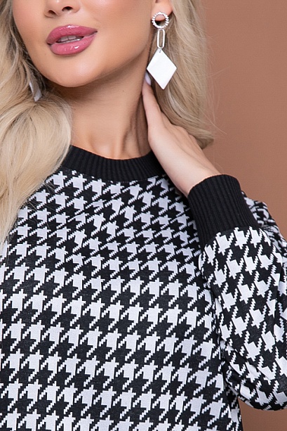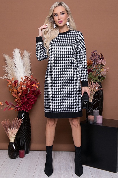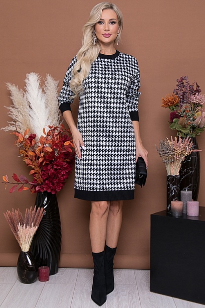 * Платье свободного силуэта из жаккардового трикотажного полотна в гусиную лапку, низ изделия, манжеты и горловина отделаны контрастной трикотажной рибаной. Ремень в комплект не входит.