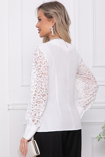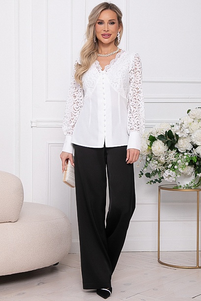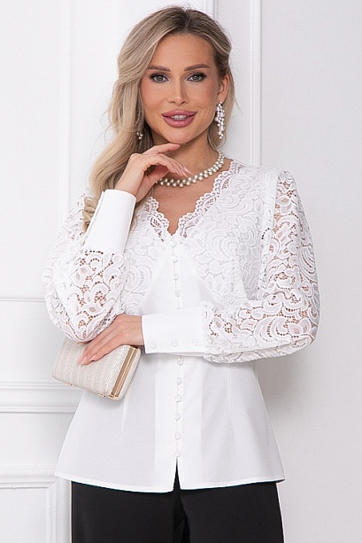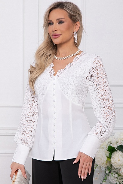 * Нарядная комбинированная блузка из текстильного полотна и кружева, по переду имитация корсажа.Верхняя часть переда на трикотажном подкладе.Центральная застежка на пуговицы.Рукава втачные из кружева заканчиваются высокой манжетой застегивающейся на пуговицы.