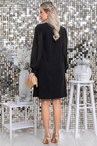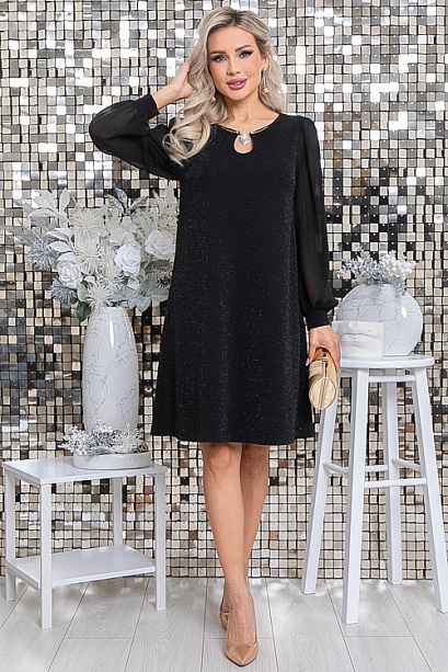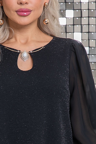 * Платье А-образного силуэта из трикотажного полотна с легким люрексом. Горловина оформлена изящной каплей и дополнена украшением с жемчужиной.