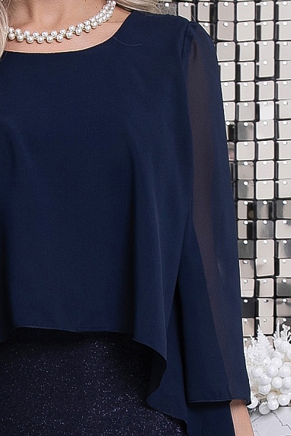 * Комбинированное  двухслойное платье. Нижнее платье полуприлегающего силуэта из трикотажного полотна с легким блеском.Верхний слой платья из шифона со шлейфом по спинке. * Длина спинки:  44-109   46-109   48-110   50-111   52-111   54-112 * Длина рукава:  44-46   46-47   48-47   50-48   52-48   54-49 * Рост модели 168 см * Размер модели 44 30% вискоза,65% п/э,5% лайкра