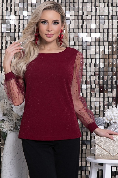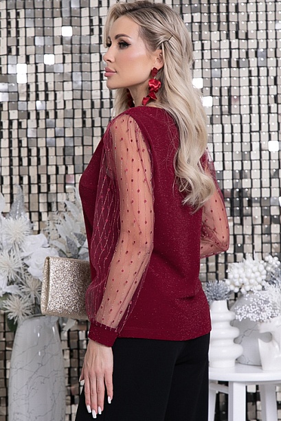 * Блузка из трикотажного полотна с люрексом и втачными рукавами из сетки. * Длина спинки:  44-61   46-62   48-62   50-63   52-64 * Длина рукава:  44-64   46-64   48-65   50-65   52-65 * Рост модели 168 см * Размер модели 44 30% вискоза,65% п/э,5% лайкра
