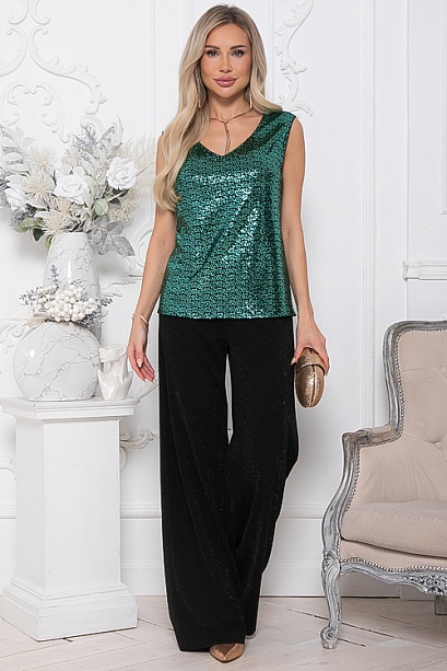 * Нарядный топ из трикотажного полотна с пайетками. * Длина спинки:  44-58   46-59   48-59   50-60   52-61   54-61 * Рост модели 168 см * Размер модели 44 30% вискоза,65% п/э,5% лайкра