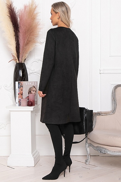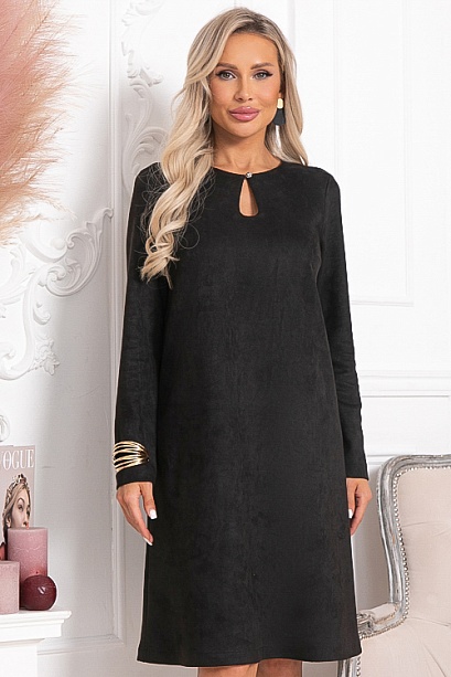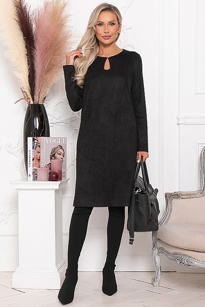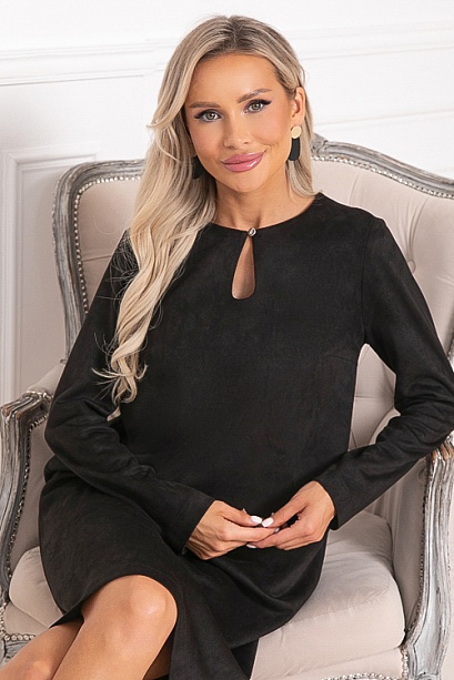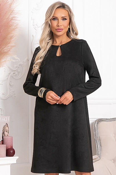 * Платье А-образного силуэта из экозамши. По горловине изящная капля с застежкой на нарядную пуговицу.