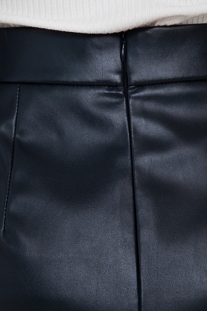 * Юбка трапецевидного силуэта из эко кожи с притачным поясом и застежка молния по спинке.