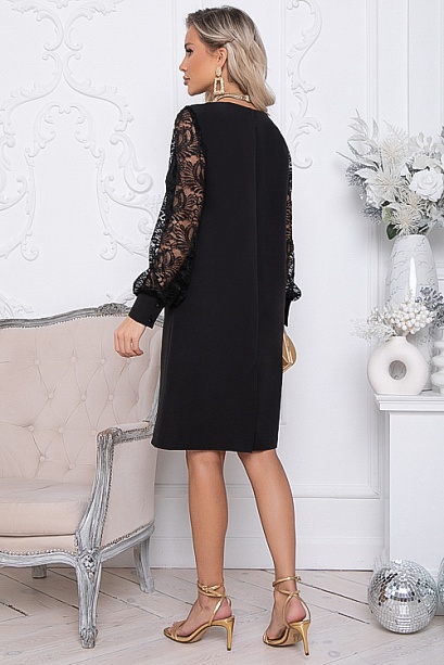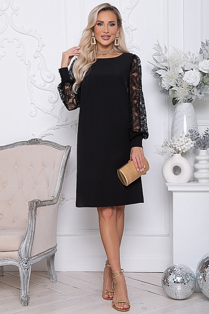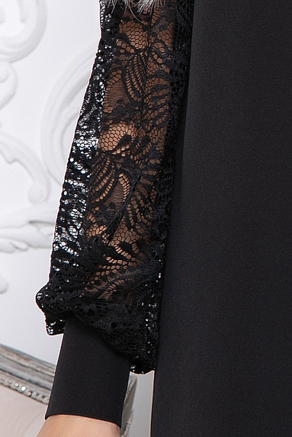 * Платье А-образного силуэта из костюмной ткани.Рукава втачные из кружевного полотна посажены на манжеты из основной ткани с застежкой на две пуговицы.