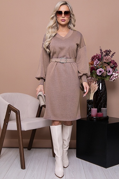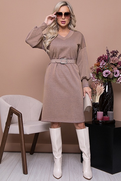 * Платье из трикотажного полотна свободного силуэта с V-вырезом горловины и разрезами по бокам. Ремень в комплект не входит.
