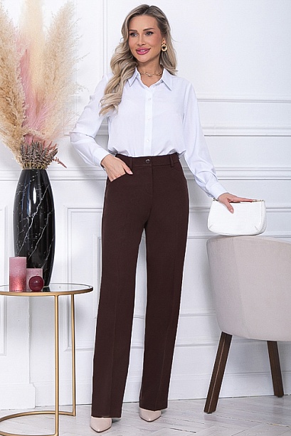 * Брюки из костюмной ткани со средней посадкой,прямого силуэта с заутюженными стрелками,по переду с боковыми функциональными карманами.Пояс притачной застегивающийся на пуговицу, по спинке собран на резину для удобства в носке.Застежка в гульфике на молнию.По спинке имитация кармана с листочкой.
