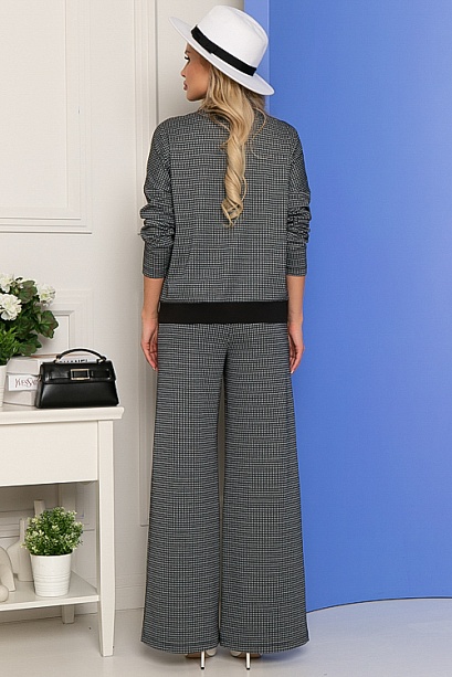 * Брючный комплект из трикотажного полотна джерси в мелкую клеточку.Кардиган свободного силуэта с однотонной отделкой и центральной застежкой на петли и пуговицы.