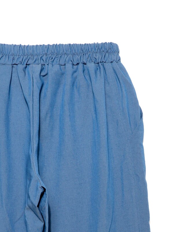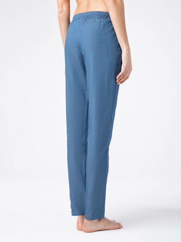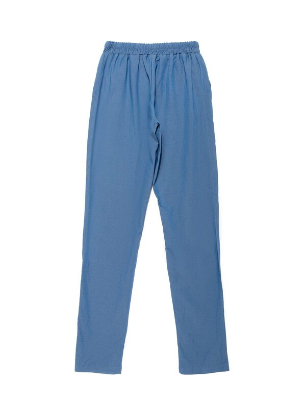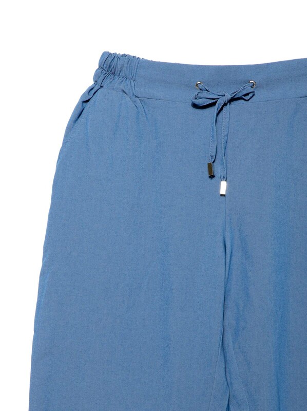 Брюки женские из однотонного текстильного материала "эффект джинс" свободного покроя с карманами. Низ изделия обработан швом в подгибку. Верхний срез изделия обработан притачным поясом с резинкой по спинке и узкими завязками, вставленными по переду в люверсы.